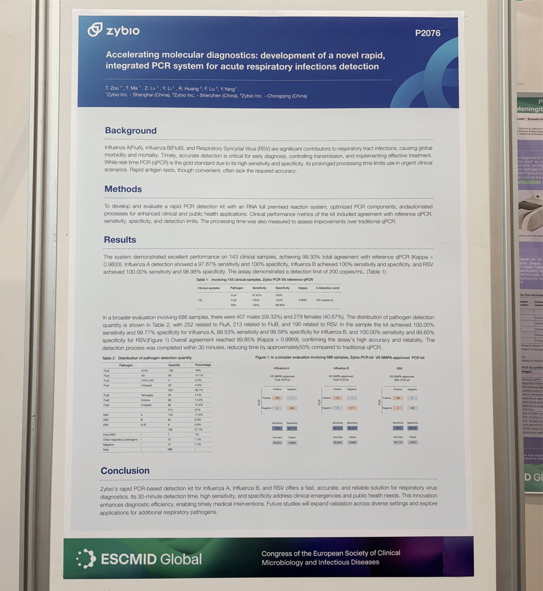 In ESCMID 2025, Zybio has 4 posters successfully accepted, which were showcased in ESCMID hall during the congress. One of them, titled “Accelerating Molecular Diagnostics: Development of a Novel Rapid, Integrated PCR System for Acute Respiratory Infections Detection” presented our cutting-edge PCR platform for acute respiratory infections. Ideal for ED & clinics, it empowers clinicians with speed and accuracy. Zybio’s rapid PCR kit for Flu A, Flu B and RSV, and finds reliable sensitivity of over 97% and specificity of over 98%.