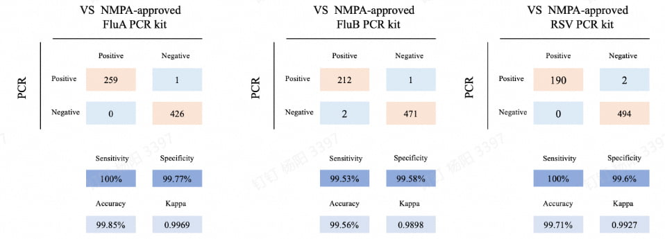The study shows 100.00% sensitivity and 99.77% specificity for FluA, 99.53% sensitivity and 99.58% specificity for FluB, and 100.00% sensitivity and 99.60% specificity for RSV.(Figure 1) Overall agreement reached 99.85% (Kappa = 0.9969), confirming the assayʼs high accuracy and reliability. Reducing time by approximately 50% compared to traditional qPCR,high sensitivity, and specificity address clinical emergencies and public health needs.