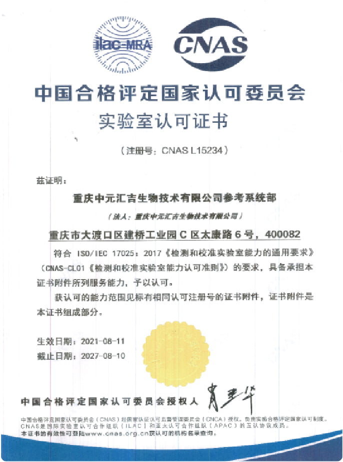 CNAS认可中元汇吉参考实验室中元汇吉检验中心通过